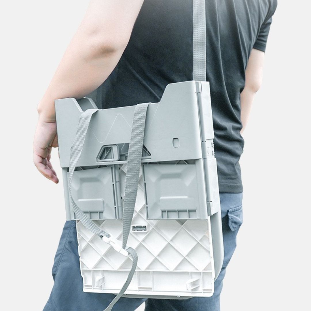 Pliage éclair (≈3 s) : se replie à plat (433×300×80 mm) pour se glisser dans un coffre, un placard ou sous la poussette. Poignée + sangle épaule pour le porter d’une main.