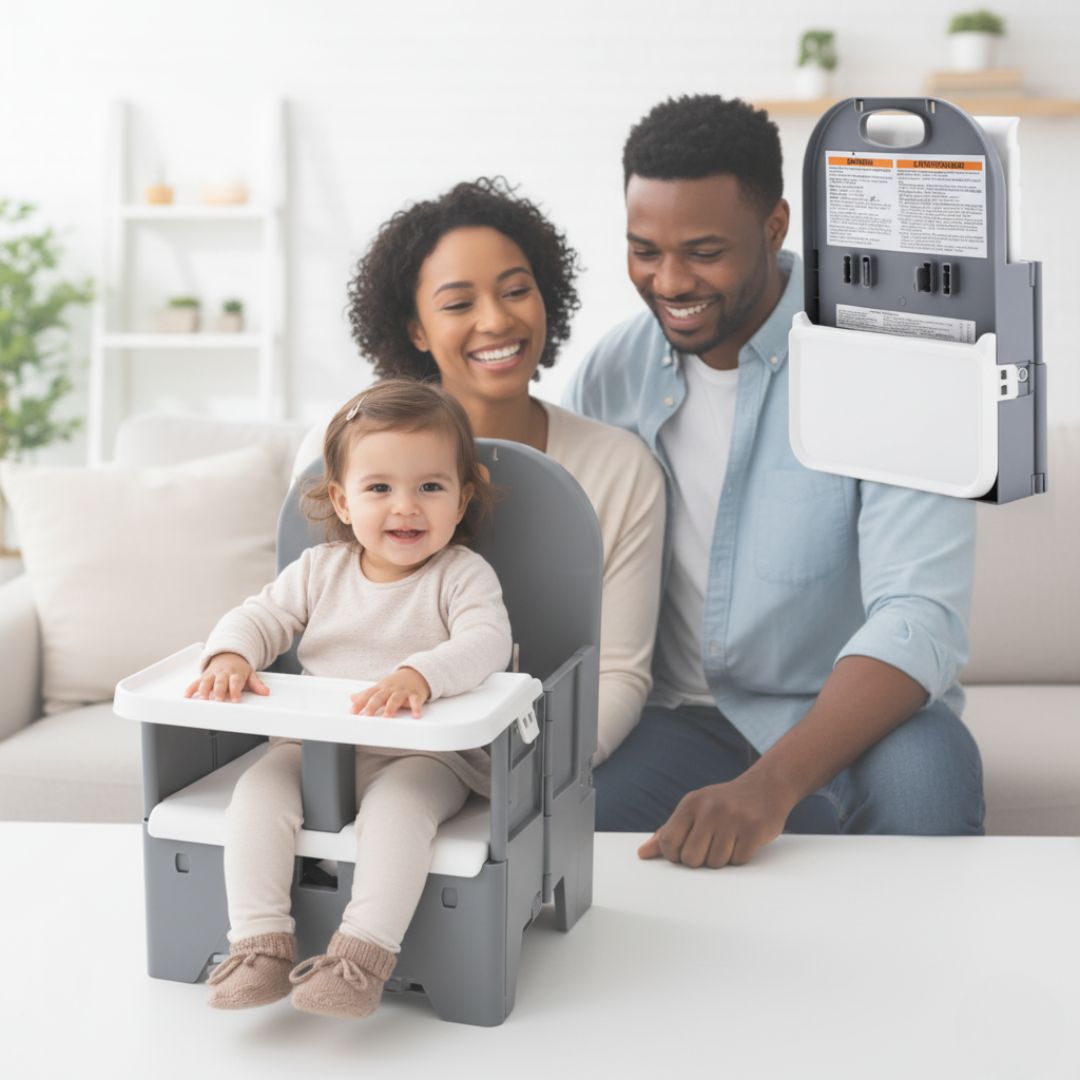 “On sort beaucoup : restaurants, parcs… Je le plie en 1 geste, il tient sous la poussette. Bébé est bien attaché et le plateau passe au lave-vaisselle. Un vrai game-changer !” – Lina R.